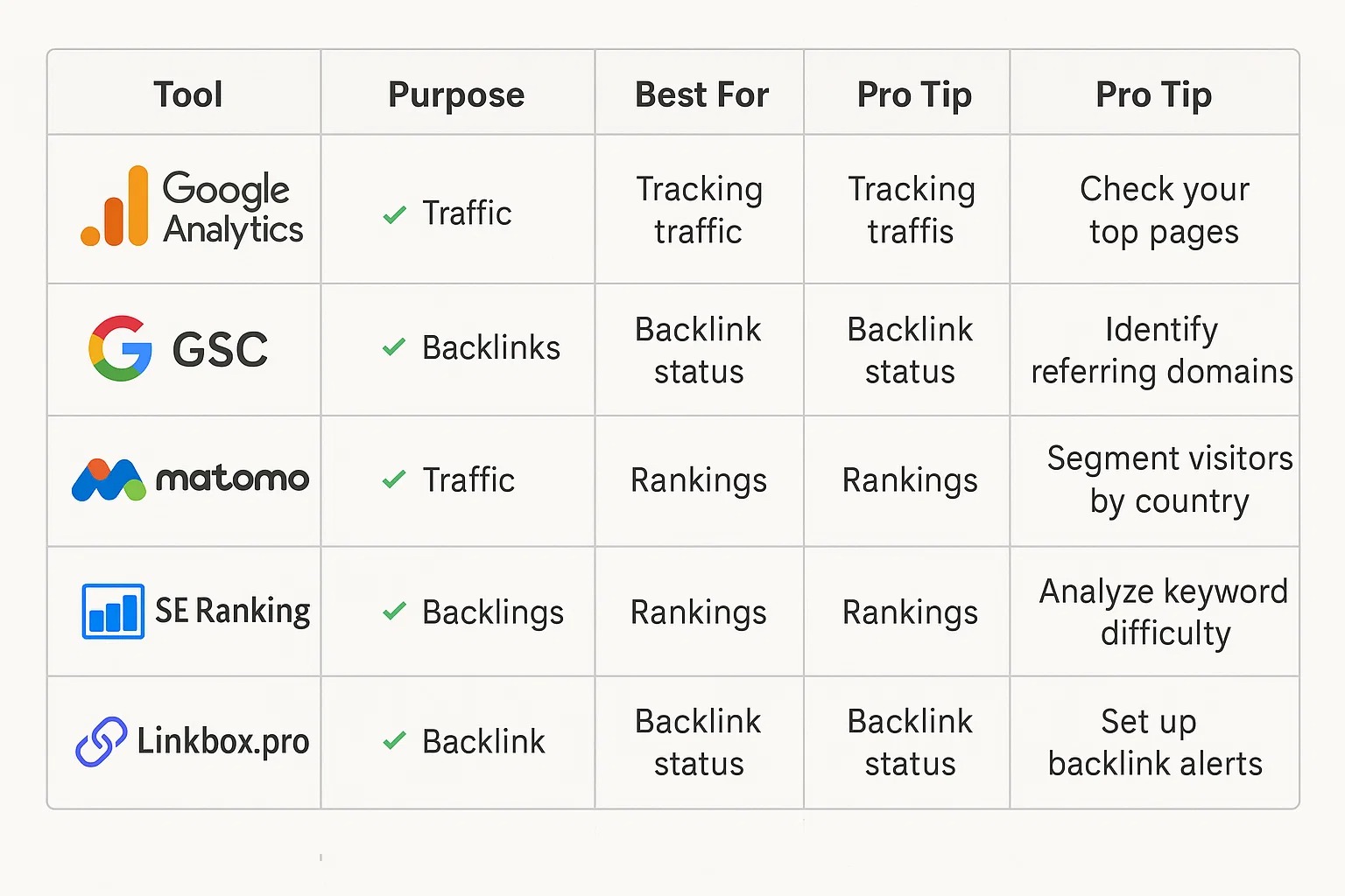 Tracking guest post performance is essential to scaling your guest posting strategy. Without tracking, you are guessing which posts work. With tools like Google Analytics, GSC, Matomo, SE Ranking, and Linkbox.pro, you can track: