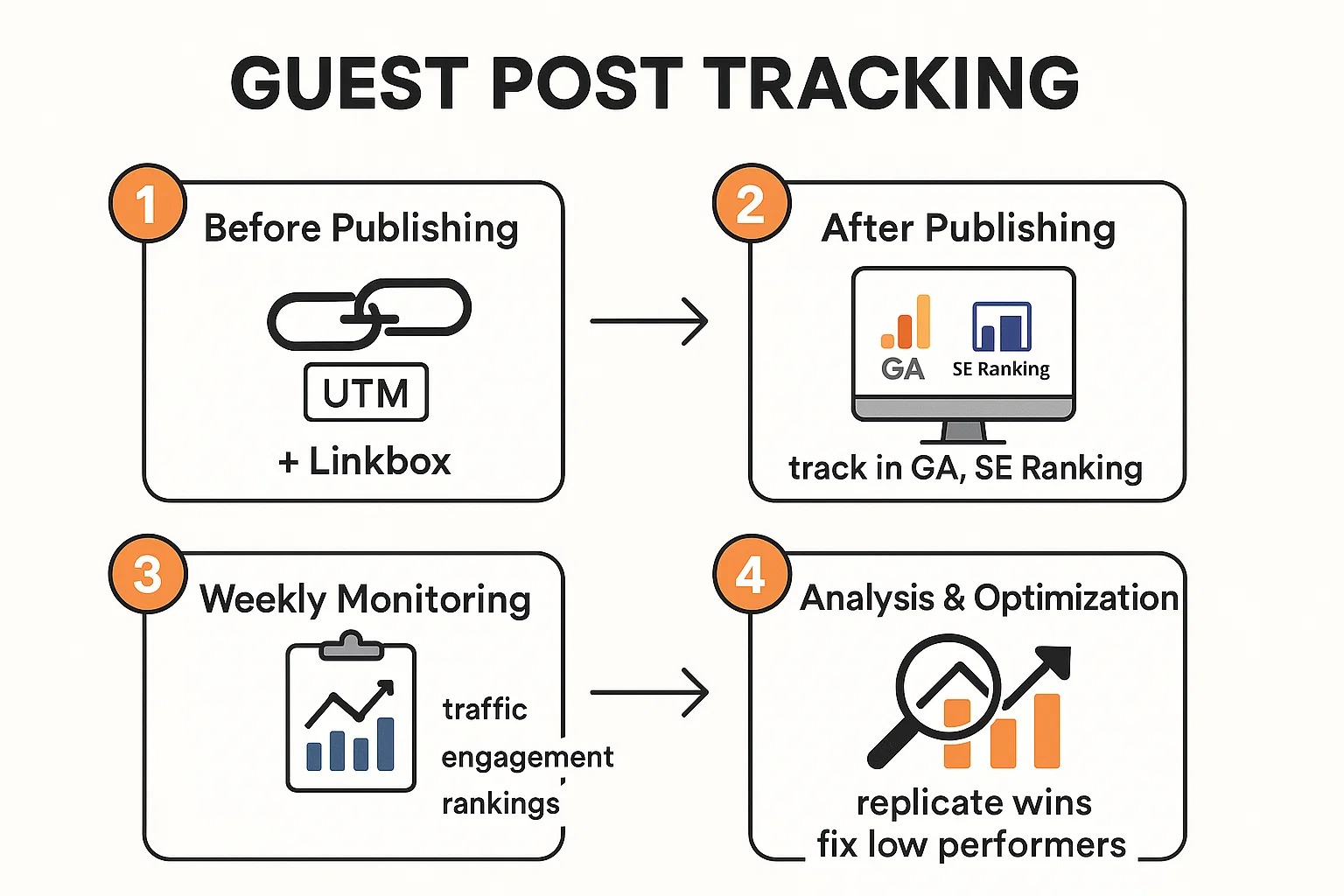 Set Up UTMs: Add tracking parameters to your guest post URLs (e.g., utm_source=guestpost&utm_medium=post&utm_campaign=site-name) to monitor which post sends traffic.