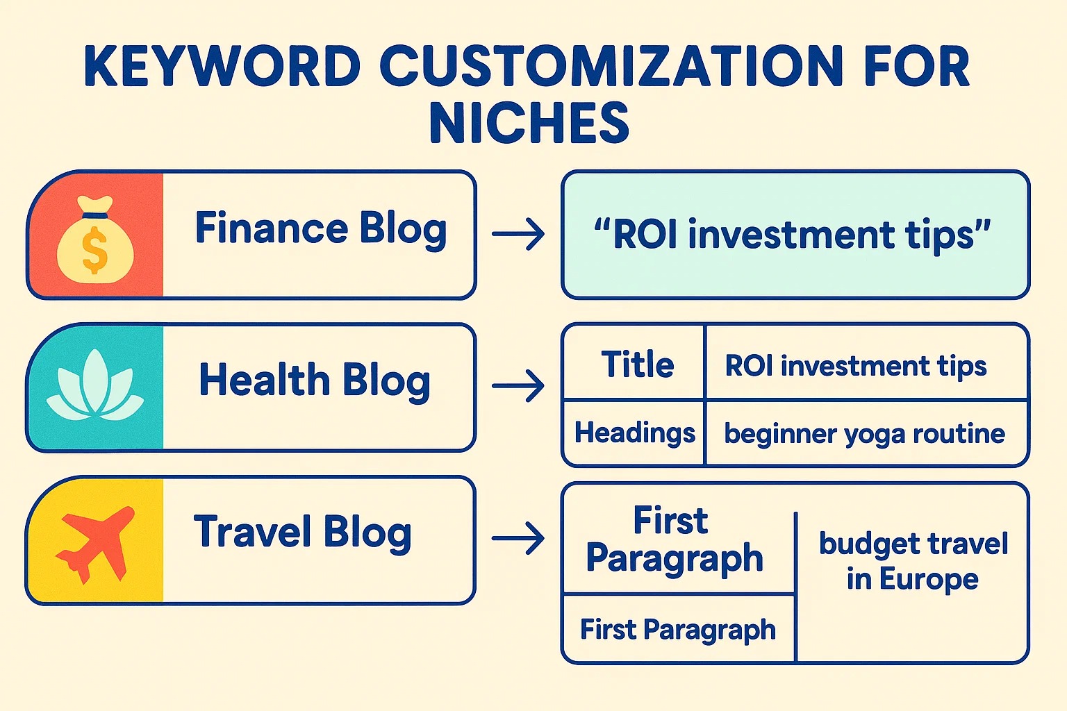 SEO Optimization: Ensure titles, meta descriptions, and headings reflect niche-specific search terms.